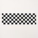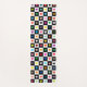 Eine gemusterte Yoga-Matte auf dem Trend mit schwarz-weißem Schachbrett mit einem Regenbogen aus farbigen Herzen auf der einen Seite und schlicht schwarz-weiß auf der anderen für das Retro-coole Skater-Ambiente mit mädchenhafter Drehung.