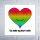 Ein Regenbogen lächelndes Herz und der romantische Text "Du machst mein Herz lächeln". Das ist ein Design über Liebe und Glück und die Freude an Freundschaft. Klicken Sie auf die Schaltfläche "Anpassen", um Ihre bevorzugte Hintergrundfarbe auszuwählen.