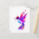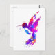 ein farbiges Aquarellwerk eines abstrakten Kolibri in Regenbogenfarben auf einer Postkarte