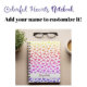 Dieses niedliche Regenbogen Glitzer Herz Notizbuch ist eine lustige Möglichkeit, Ihre Gedanken zu protokollieren oder Notizen zu machen. Ideal, um eine Aufgabenliste zu schreiben oder um Dinge, die man nicht zu vergessen will, in einem Portemonnaie oder einer Computertasche behalten. Mit einem robusten Cover und Uni-regierten Seiten. Das wäre großartig für dich selbst, als Geschenk für den Valentinstag oder als "nur weil" Geschenk. Personalisieren Sie diese, indem Sie Ihren Namen mit dem Bearbeitungswerkzeug in der Liste hinzufügen. Personalisierte Spiralnotebooks online von Zazzle zu kaufen, ist die beste Möglichkeit, um individuelle Notebooks mit Namen, Fotos, Firmenlogos oder Designs zu erhalten, die Sie selbst erstellen oder aus unseren Vorlagen auswählen, um Sie zu starten. Man kann sich spiralförmige personalisierte Notizbücher in loser Schüttung ohne Mindestmaß zulegen. Ideal für Erwachsene oder für Schule oder Journalisten. Sie sind in den Größen 5x8 oder 5x8 erhältlich und eignen sich für den persönlichen Gebrauch oder für Werbezwecke.