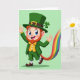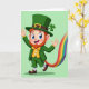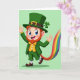 This greeting card features a jubilant leprechaun front and center, dressed in an emerald green suit with a tall top hat topped by a gold buckle and a tiny shamrock ☘️. His fiery red hair and beard frame rosy cheeks and bright sapphire-blue eyes, and his wide smile feels like it’s meant for a dear friend standing just off to the side. With both arms lifted as if inviting a hug or pulling someone into a dance, he stands in small buckled shoes that look ready to tap across the page. Behind him, a sweeping rainbow 🌈 curves from deep red through violet, adding a dreamy backdrop that makes the moment feel shared and a little secret. The background stays a soft, pale green so the leprechaun and rainbow remain the main focus. A short St. Patrick’s Day greeting appears near the top in green lettering, with smaller matching text tucked neatly near the bottom. The rainbow’s bands are softly blended, arching behind his hat and shoulders against the pale green field.