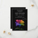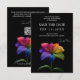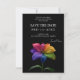 A bold and modern Save the Date card from the Technicolor Love collection, featuring the vibrant rainbow lily in full multicolored bloom against a dramatic black backdrop. The front announces your date with clarity and warmth, while the design radiates joy, pride, and celebration.