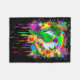 Farbenfrohe und exotisch kleine Regenbogen-Lorikeet-Papagei auf tropischen Blume, Palmen, Regenbogenfarben-Kreis, farbenfrohe Paint Stains and Drops Hintergrund.