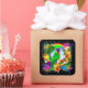 Farbenfrohe und exotisch kleine Regenbogen-Lorikeet-Papagei auf tropischen Blume, Palmen, Regenbogenfarben-Kreis, farbenfrohe Paint Stains and Drops Hintergrund.