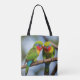 Tragen Sie ein Stück Natur mit, wohin Sie auch gehen, mit dieser lebendigen Totentasche mit zwei atemberaubenden Regenbogenlampen, die auf einem Ast stehen. Ihr lebhafter Absturz in Grün-, Blau-, Gelb- und Rottönen spiegelt den Charme und die Brillanz dieser berühmten Vögel wider.