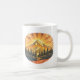 A radiant rainbow mountain sunrise scene that blends warmth with vintage outdoor charm. Golden sun rays burst behind a glowing peak, layered with soft clouds, forest silhouettes, and rolling hills in rich sun soaked tones. Perfect for nature lovers, hikers, mountain souls, and anyone drawn to sunrise magic and mountain landscapes. This uplifting coffee mug captures that quiet moment when the world wakes up — bold, peaceful, and full of possibility.