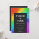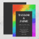Hochzeitseinladung für eine homosexuelle oder lesbische Hochzeit mit modernem Typografie-Design in Schwarz und Weiß vor einem regenbogenfarbenen Hintergrund.