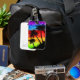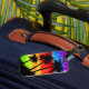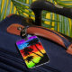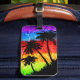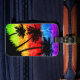 a decorative artwork featuring the silhouettes of several palm trees growing under a very colorful and surreal rainbow sky.