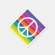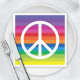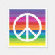 Papierservietten mit weißem Friedenszeichen auf einem farbenfrohen, mit Regenbogen gestreiften Hintergrund.