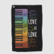 Abstrakte Regenbogenpiano-Illustration mit Regenbogen-Musiknoten und "Liebe ist Liebe" Textdekoration