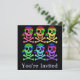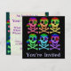 Benutzerdefinierte zweiseitige Einladungskarten. Front hat anpassbare "You're Invited". Zurück hat Einladungsinformationen - geben Sie Ihren Veranstaltungstitel, Datum, Uhrzeit, Ort sowie zusätzliche Informationen oder persönliche Nachricht ein. Muster von sechs Schädeln und Kreuzknochen in Regenbogenfarben (rot-orange gelb, unten grün-blau lila). Jeder Schädel hat Regenbogenaugen und Bandannas. Farbenfrohe und einfache Möbel für Piratenschädel zu Halloween oder jederzeit.