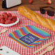 Farbenfrohe Papiertafel mit Regenbogen-Pop, einem Muster, das wie ein beliebtes Fidget / Sinnesspielzeug und Accessoires aussieht. Anpassen mit Namen oder Nachricht im mittleren Textquadrat.