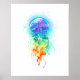 Große, rieszierende, künstlerisch gezeichnet, helle Quallen mit langen Tentakeln auf Weiß, mit farbenfrohen Aquarellbildern überstrichen. Rainbow-Quallen
