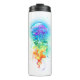 Große, rieszierende, künstlerisch gezeichnet, helle Quallen mit langen Tentakeln auf Weiß, mit farbenfrohen Aquarellbildern überstrichen. Rainbow-Quallen
