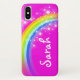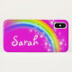 Hübsche Regenbogen Design Mädchen iPhone Gehäuse. Personalisieren Sie mit dem Namen Ihres Kindes bis zu 5 Buchstaben. Dieses Beispiel liest Sarah. Exklusiv von Sarah Trett entworfen und illustriert.