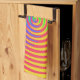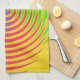 Hier ist ein buntes Küchentuch mit einem abstrakten, abgerundeten Regenbogenmuster, das um ein zentrales Ziel in den Farben Grün, Blau, Gelb, Orange und Rot wirbelt. Kann im Kontext von LGBT verwendet werden.
