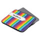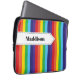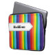 Der Laptop-Ärmel mit seinem hellen Regenbogen ist mit einem weißen Bannerband und schwarzen Heftdetails über dem oberen Teil versehen. Es ist mit einem Namen oder einem beliebigen Text personalisiert, den Sie gewollt haben.