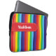 Der Laptop-Ärmel mit seinem hellen Regenbogen ist mit einem roten Bannerband und weißen Heftdetails versehen. Es ist mit einem Namen oder einem beliebigen Text personalisiert, den Sie gewollt haben.