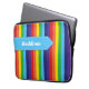 Der Laptop-Ärmel mit seinem hellen Regenbogen ist mit einem hellblauen Bannerband versehen, das über der Oberseite eine weiße Naht aufweist. Es ist mit einem Namen oder einem beliebigen Text personalisiert, den Sie gewollt haben.