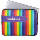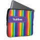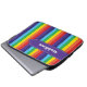 Der Laptop-Ärmel mit seinem hellen Regenbogen ist mit einem lila Bannerband versehen, das über der Oberseite mit Details zum weißen Heften versehen ist. Es ist mit einem Namen oder einem beliebigen Text personalisiert, den Sie gewollt haben.