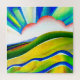 Digitales Aquarellbild in lebhaften Regenbogenfarben und -texturen mit Sonnenaufgang und hervorstehenden Sonnenstrahlen.