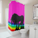 Ein heller, kühner und wunderschöner Duschvorhang mit eingemauerten Motiven und einem schwarzen mystischen Einhorn und einem Regenbogenhintergrund. Die perfekte Badezimmerdekoration für den Einhornliebhaber in Ihrem Leben!