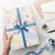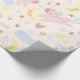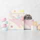 Umhüllungspapier mit fröhlichen Einhorn- und Sternenhimmel-Illustrationen auf pastellfarbenem Hintergrund. Karo in unserem Laden für mehr Verpackungspapier, geeignet für Kindergeburtstage und Babyduschen.