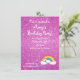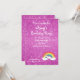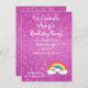 Einladung zum Geburtstag mit Einhorn auf Regenbogen und Wolken mit Imitaten Rosa Glitzer Hintergrund
