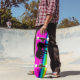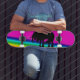 Eine helle, kühne und schöne Einhorn-Geburtstagseinladung mit einem schwarzen mystischen Einhorn und einem Regenbogenhintergrund. Das perfekte Skateboard für Ihren Einhornliebhaber!