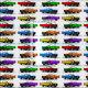 Diese lustige und lebendige Illustration zeigt ein Muster von Sportwagen der 50er Jahre in einem Regenbogen von Farben.