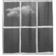 Alte Fensterscheibe aus Holz mit Regentropfen und grauer Himmel mit Wolke. Die Hintergrundfarbe kann geändert werden.