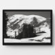 Ein Schwarz-Weiß-Foto des Berges Rainier mit Schnee bedeckt. Einige Steine sind freigelegt. Das Eis und der Schnee des Vulkans schmelzen weg. Einige Bäume durchbrechen die raue Landschaft. Image Copyright ©2023 Kimberly J Tilley. zazzle.com/store/developingnature