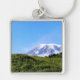 Blick auf den Rainier und die umliegenden grünen Hügel an einem sonnigen Frühlingstag.