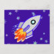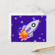 Helles Cartoon-Raketenschiff, das mit Sternen im Hintergrund durch den Weltraum zoomt