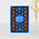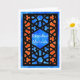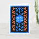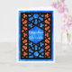 Eine Ramadhan Grußkarte mit einem traditionellen islamischen Gittermuster in schwarz auf blauem und orangefarbenem Hintergrund. Der Text im zentralen Bereich ist weiß und lautet "Ramadhan Mubarak". Design handbemalt in Aquarellen von Judy Adamson. Die Innenseite wird für Ihre eigene Nachricht leer verlassen.