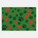Zeichnungen von Hundepuppprints und roten Herzen in vielen Größen. Maßgeschneidertes Verpackungspapier mit grünem, weißem und goldenem Hintergrund. Geschenkidee für Menschen jeden Alters, die Liebe Hunde.