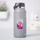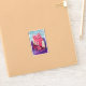 A slice of cake topped with vibrant red raspberries drips with rich sauce onto a dark purple plate. The background features a blue lattice pattern, complementing the dessert's vivid colors.