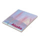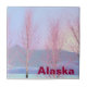 Ein digitales Bild von schneebedeckten Birkenbäumen; der Schnee gefärbt von der untergehenden Sonne. Es erscheint auch das Textlesen "Alaska". Hier im Norden ist es üblich, schneebedeckte Bäume zu sehen, die von der Sonne am Horizont tief in Rosa oder Orange eingefärbt sind.