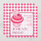 Eine Geburtstagsfeier mit einem Hintergrund von rosa Polka-Punkten vor und zurück. Vorderseite zeigt eine Abbildung eines Himbeerkuchens oben links. Passen Sie die Nummer auf dem Kuchentopf an. Personalisieren Sie den Text unter und rechts vom Kuchen mit Details Ihrer Gelegenheit. Text umgeben von rosa Rahmen.