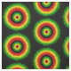 Abstract geometric tie-dye effect circles pattern in red, yellow and green on black