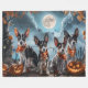 Entfesseln Sie den unheimlichen Geist mit diesem unheimlichen Halloween-Design, das eine Hundepackung unter einem dunklen, mondbeleuchteten Himmel bietet, umgeben von fliegenden Fledermäusen und glühenden Kürbissen. Ideal für diejenigen, die mit ihren wütenden Freunden eine Touch voller Furcht Liebe haben!