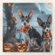 Entfesseln Sie den unheimlichen Geist mit diesem unheimlichen Halloween-Design, das eine Hundepackung unter einem dunklen, mondbeleuchteten Himmel bietet, umgeben von fliegenden Fledermäusen und glühenden Kürbissen. Ideal für diejenigen, die mit ihren wütenden Freunden eine Touch voller Furcht Liebe haben!
