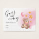 Ein Mädchen Teddy Bär Baby Dusche Spiel mit einem einfachen schlichten weißen Hintergrund, ein Aquarellbär, rosa Ballon, goldene Sterne & eine Babyflasche, und eine "raten Sie, wie viele" Vorlage, die leicht zu personalisieren ist.
