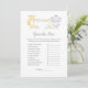 Dies ist eine "Guess The Right Price" Baby Duschkarte. Niedlicher Fuchs und Elefant mit einem Banner mit einem sonnigen Kaninchen im Auto, rosa Babyblöcken und Giraffengestopfte Tiere auf weißem Hintergrund vorne und gelber Hintergrund mit weißen Polka-Punkten auf der Rückseite.