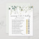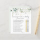 Dieses Design verfügt über ein Baby Shower Game "Guess Who - Mommy or Daddy" im Watercolor-Stil mit Eukalyptus-Blätter. Oben auf der Karte - grünlich und golden Effekt Konfetti. Der Text "mommy or daddy" ist in Skript-Schriftart mit geeintem Herzen geschrieben.