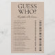 Dieses schöne rustikale Guess Who - Brautparty Spielblatt ist einfach und charmant - ideal für jede Dusche. Dieses lustige und leichte Spiel bringt jedem Brautparty viel Lachen. Einfach jedem Gast ein Blatt geben (vergessen Sie nicht die Stifte) und den Spaß gelassen beginnen! Sie werden erstaunt sein, wie viele verschiedene Dinge die Leute über Braut und Bräutigam wissen. Um dieses Spiel zu Ihrem eigenen zu machen, wählen Sie einfach diese Vorlage personalisieren und geben Sie den Namen der Braut und den Namen des Bräutigams ein.