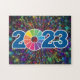 2023 neues Jahr Rätsel mit einer brillanten Anzeige von Feuerwerken und das Datum 2023.
