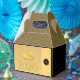 Elegantes Design mit goldenem Papierschnitt einer Ratte mit Früchten (+ das gleiche Papier in grauem Formung Schlagschatten geschnitten. Design auf Gable Gvor Box Karte mit Groß 2020, Jahr der Ratte und Monogramm auf schwarz rund + + Schwarz und dekorative Muster Hintergrund, Sie können leicht ändern Text (Schriftart, Farbe, Größe und Position), indem Sie auf die Schaltfläche Anpassen. Passende Postkarte; Grußkarte, Einladung, Aufkleber und mehr. Ideal für ein personalisiertes chinesisches Neujahr 2020.