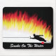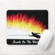 Mousepad mit Bild des Slalomwasser-Skifahrers, der oben eine Wand der Flammen anstelle des Wassers tritt. Schließt Text "Rauch auf dem Wasser" ein