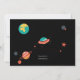 Eine bunte Einladung, die ein Raumschiff mit einem Fotofenster, -planeten und -sternen in einem schwarzen Hintergrund kennzeichnet. Eine herrliche Einladung für Ihr Raumthema Party.